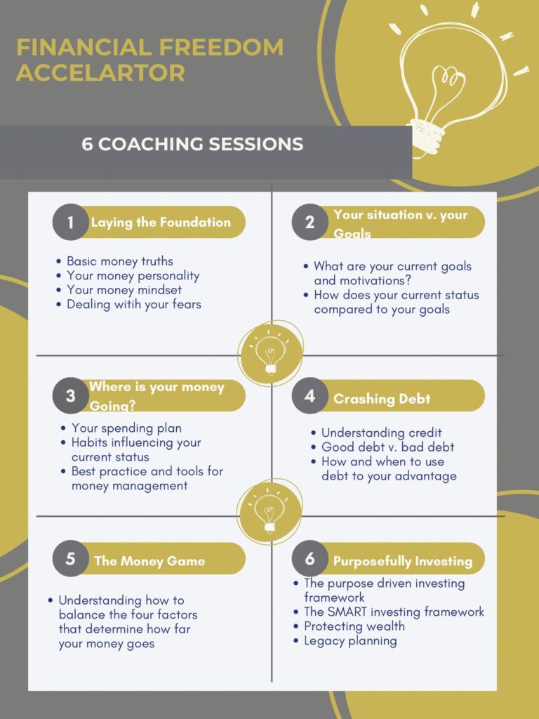 The coaching is delivered in 6 sessions either as group or individual coaching to create a financial blueprint that will unlock your freedom