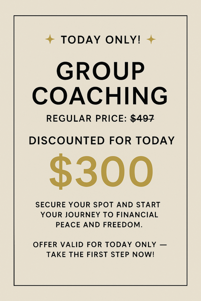 Get personalized, laser-focused financial coaching tailored to your goals, lifestyle, and challenges. With one-on-one guidance, you’ll gain clarity, master your money, and confidently take steps toward financial independence. This is your private roadmap to peace, power, and financial freedom. Choose a time that suits you for the 6 coaching sessions.